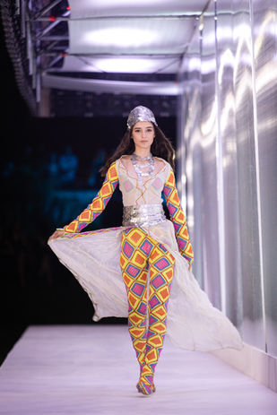 At its core lies the traditional shirt, which preserves the collection’s silhouette, and the colorful socks — reimagined into various forms such as tights, gloves, belts, and scarves — transforming heritage details into contemporary expressions.